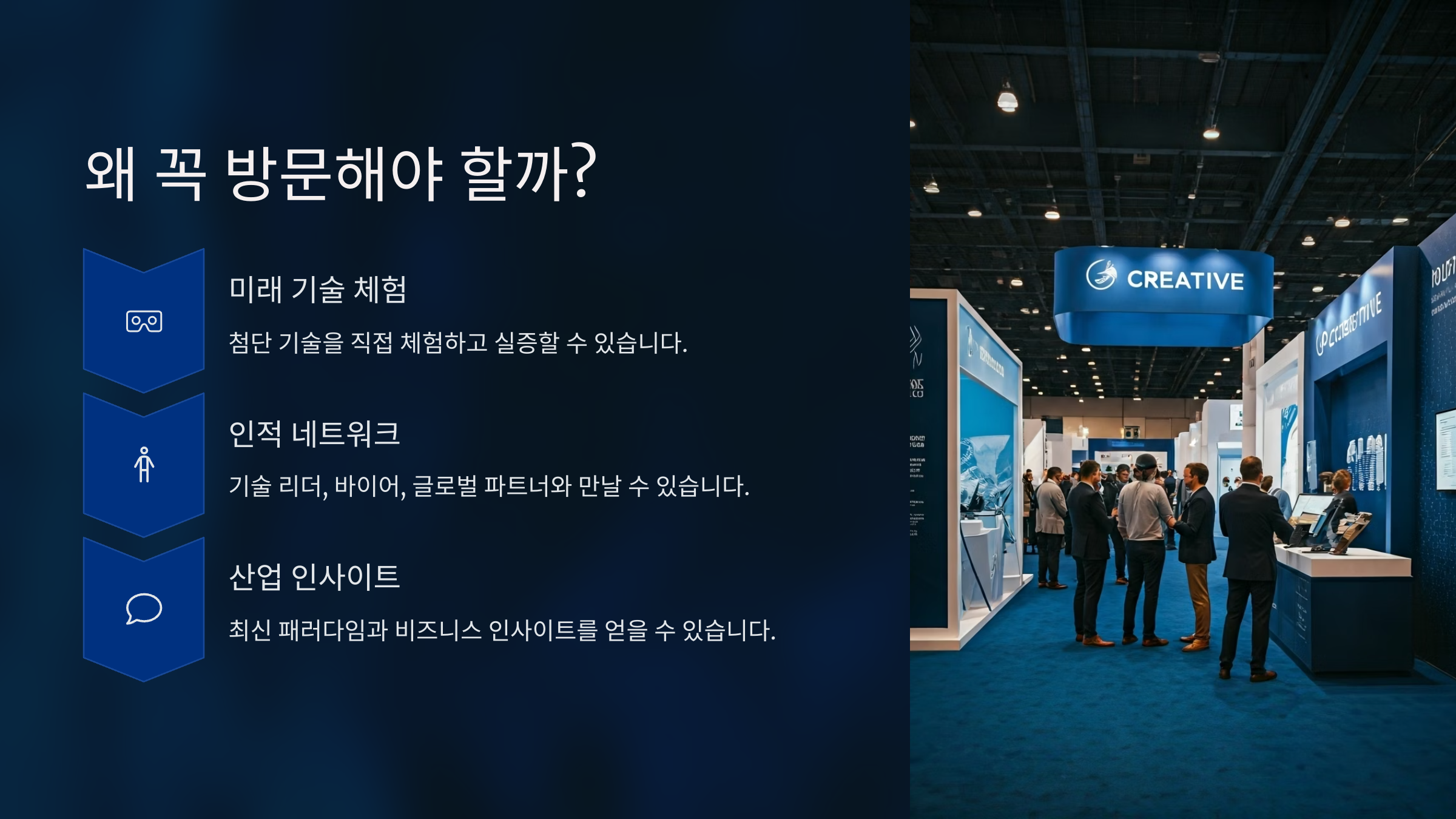 전시를 통해 기술을 체험하고, 세미나에서 인사이트를 얻고, 비즈니스 미팅을 통해 미래 파트너를 만나는 '3 in 1' 구성은 다른 어떤 행사보다 유용하다는 평이 많아요.