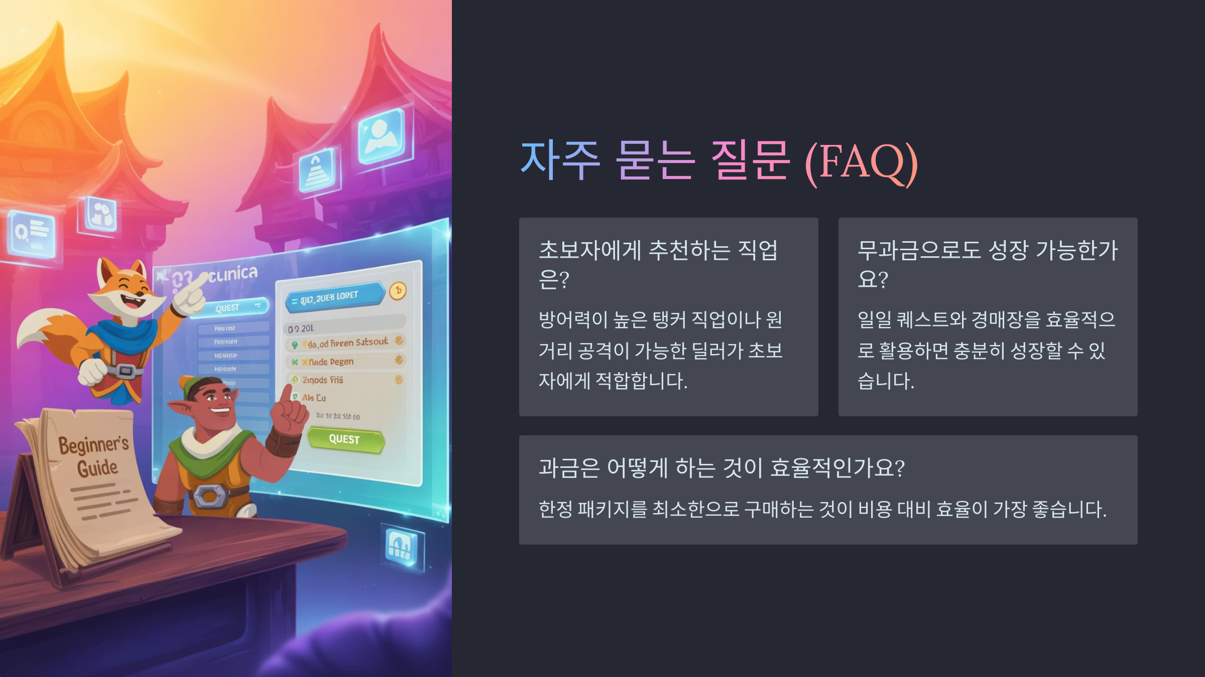 A8. 매일 30분~1시간이면 충분해요. 자동전투 시스템과 이벤트 알림 기능이 잘 되어 있어서 시간 대비 효율적인 성장이 가능해요.