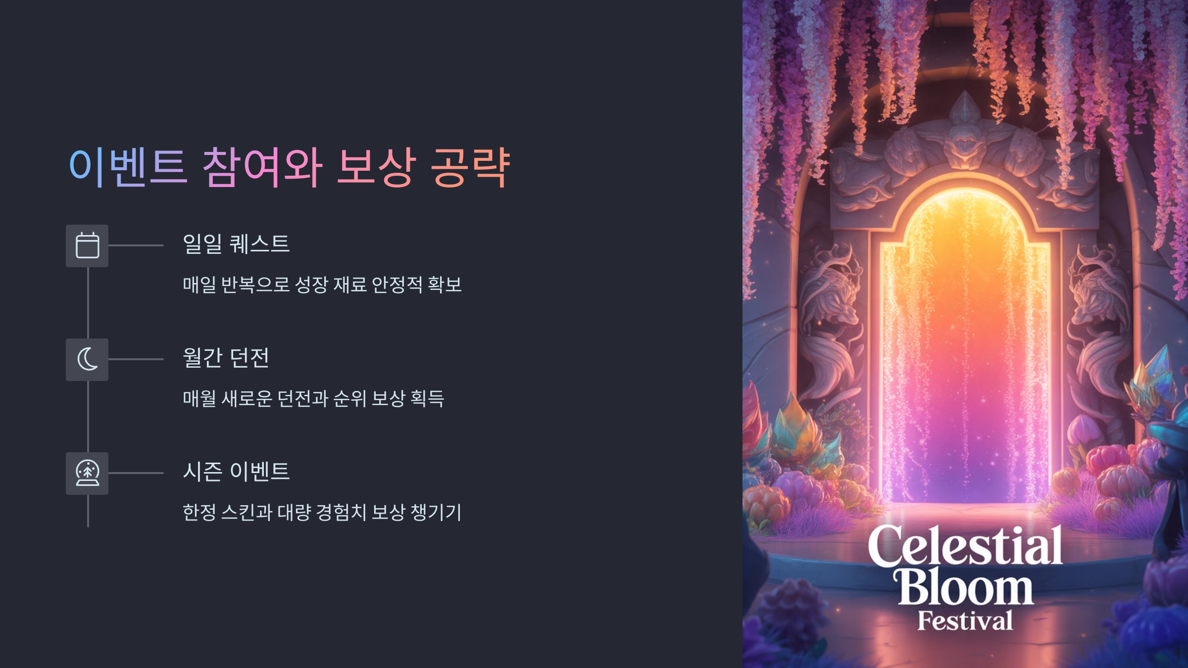 이벤트는 크게 세 가지로 나뉘어요. 첫째는 참여형 미션 이벤트, 둘째는 경쟁형 리그 이벤트, 셋째는 협력형 연합 이벤트예요. 각 이벤트마다 보상의 종류도 다르기 때문에 전략적으로 어떤 이벤트에 집중할지 판단해야 해요.