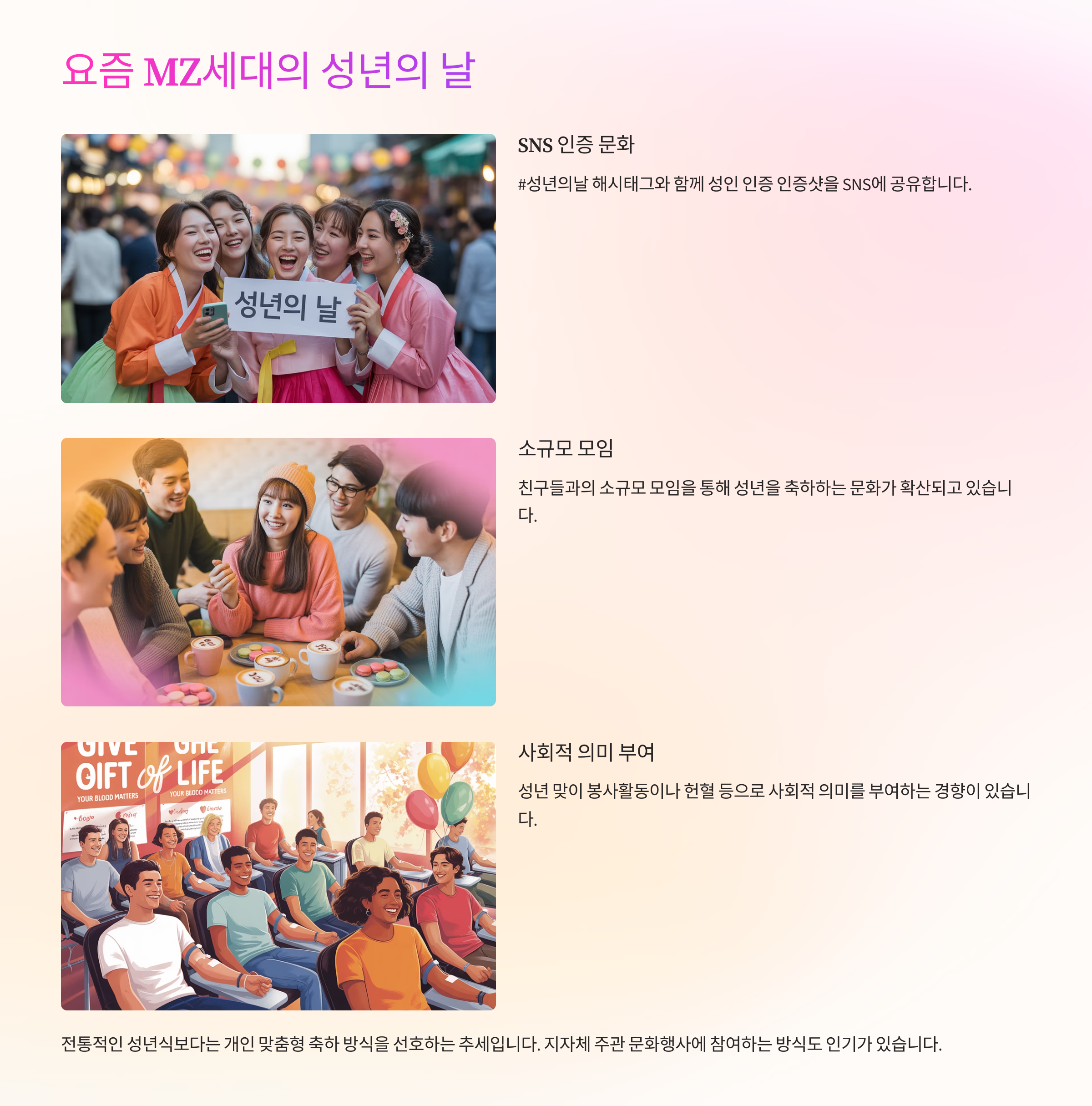 이처럼 성년의 날은 지금 이 순간에도 진화하고 있어요. 형식보다는 진심이 중요한 시대, 성인이 된다는 것은 이제 단지 사회적 지위만이 아니라 나 자신을 존중하는 의미까지 포함된다는 걸 MZ세대는 잘 보여주고 있답니다.