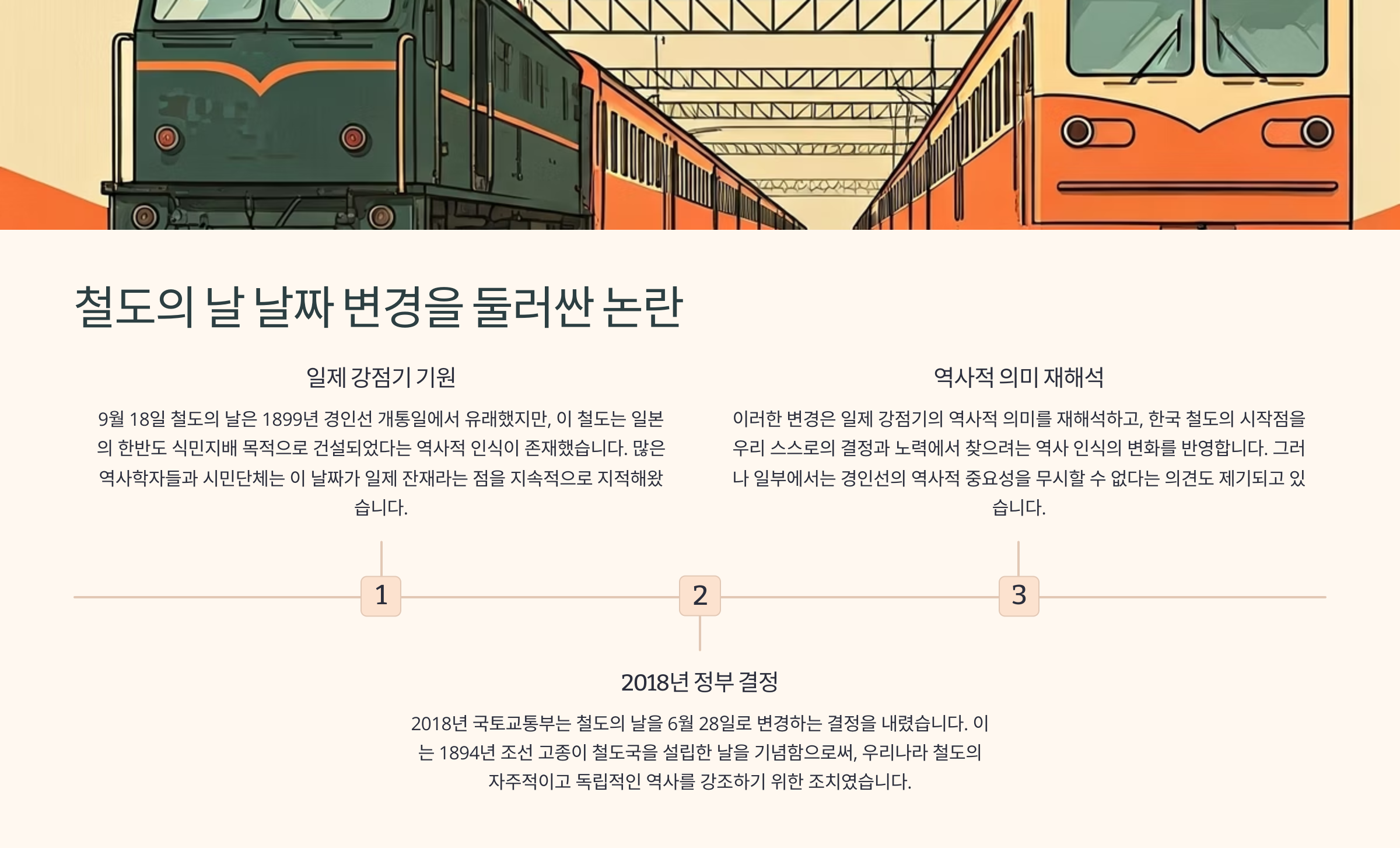 그래서 2018년부터는 일제 잔재를 털고 우리나라가 주체적으로 설립한 ‘철도국’의 창설일인 1894년 6월 28일로 날짜가 변경되었답니다. 이 날짜는 대한제국이 철도 행정을 시작한 시점을 상징하기 때문에 자주성과 역사적 의미가 강조돼요.