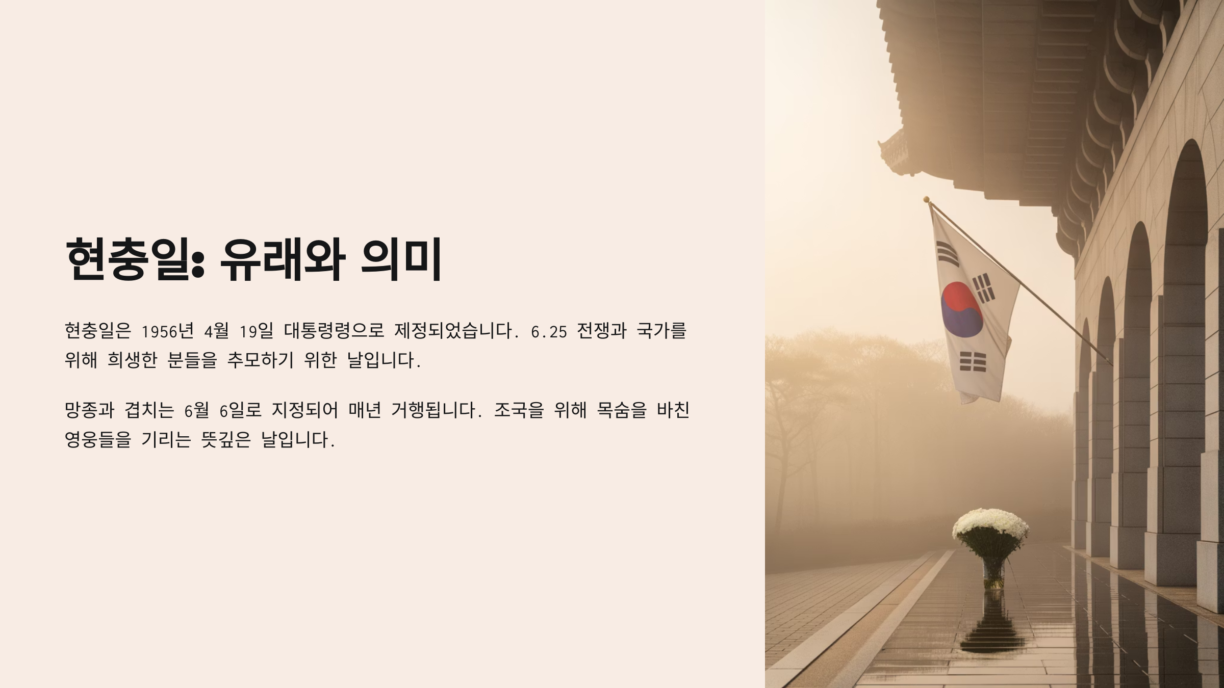 당시 6·25 전쟁이 끝난 지 얼마 되지 않았고, 많은 국민들이 가족과 이웃을 전장에서 잃은 아픔을 겪고 있었어요. 이러한 역사적 배경 속에서 국가 차원에서 희생자들을 추모하고 기억하려는 노력으로 현충일이 생겨났다고 할 수 있어요.