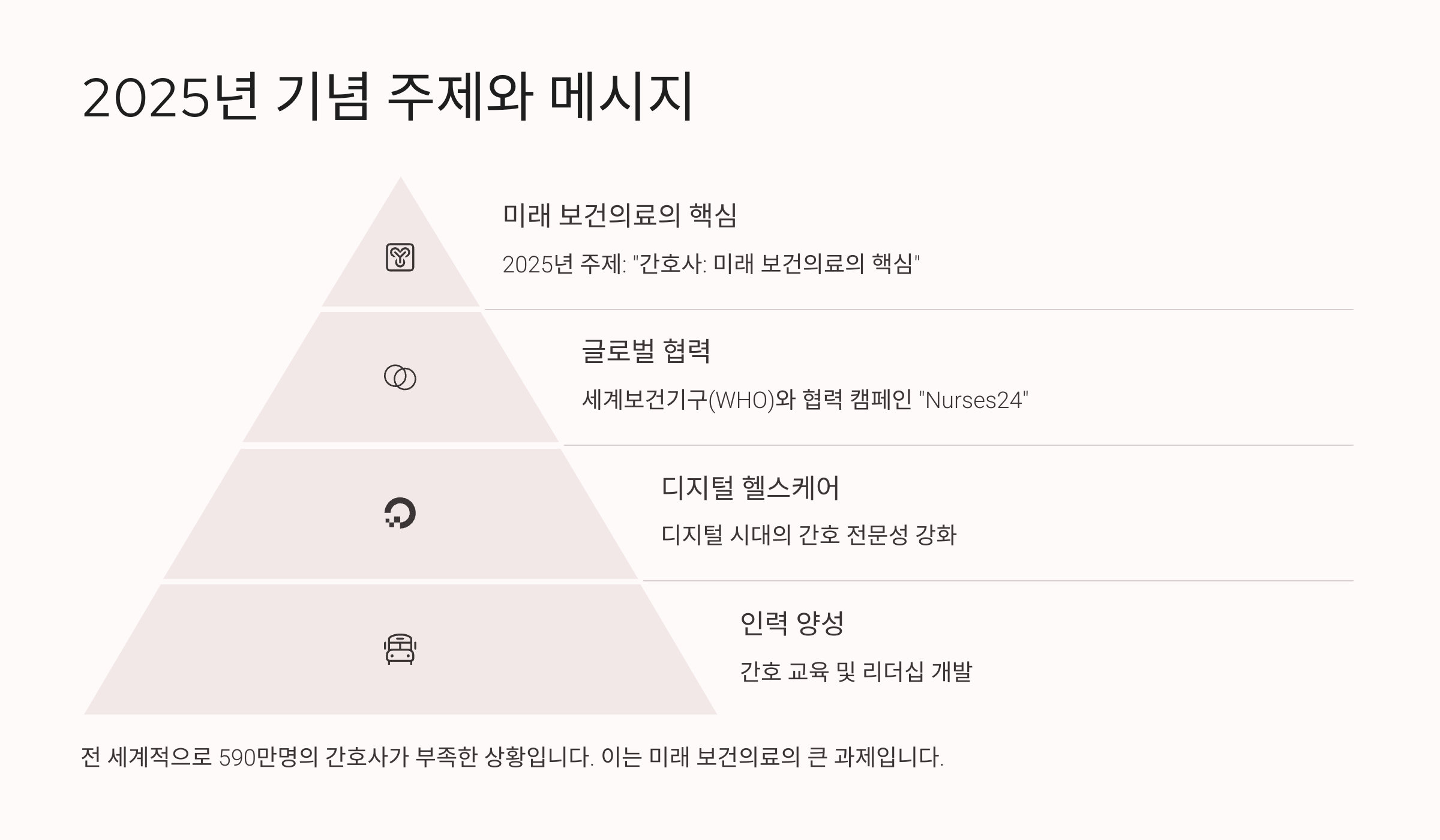 2025년 국제 간호의 날의 공식 주제는 “Our Nurses. Our Future. The Economic Power of Care”로 발표되었어요. 이 주제는 간호의 중요성을 단순히 '돌봄'의 가치로만 보는 것이 아니라, 경제적 영향력까지 조명하고자 하는 강한 메시지를 담고 있어요. 간호사들이 의료시스템에 얼마나 중요한 자산인지를 경제적 수치와 영향력을 통해 강조하려는 목적이죠.
