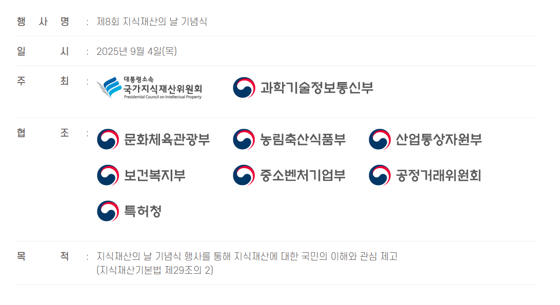 ※ 본 글은 2025년 제8회 지식재산의 날 공식 자료와 공개된 정보를 기반으로 작성되었습니다. 일부 세부 내용은 주최 측 사정에 따라 변경될 수 있습니다.