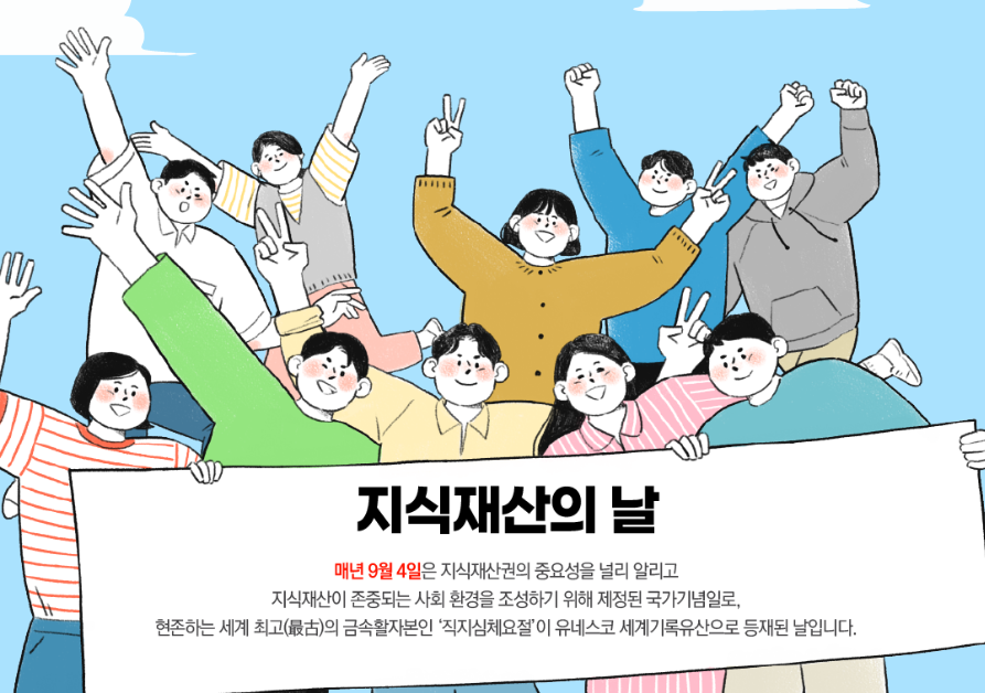 지식재산의 날은 세계에서 가장 오래된 금속활자본 ‘직지심체요절’이 유네스코 세계기록유산으로 등재된 9월 4일을 기념해 제정되었어요. 직지는 우리 민족의 창의성과 기술력을 상징하는 문화유산이에요.