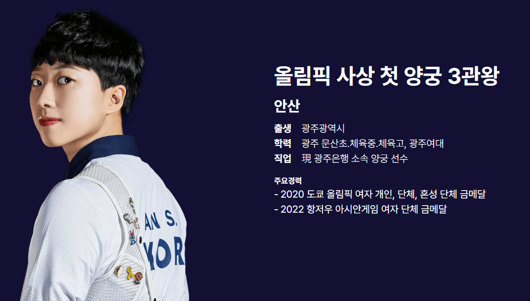 먼저, 올림픽 사상 최초의 양궁 3관왕 '안산' 선수! 광주 출신으로 광주은행 소속이었어요. 2020 도쿄 올림픽에서 개인, 단체, 혼성 모두 금메달을 따며 역사를 썼죠.