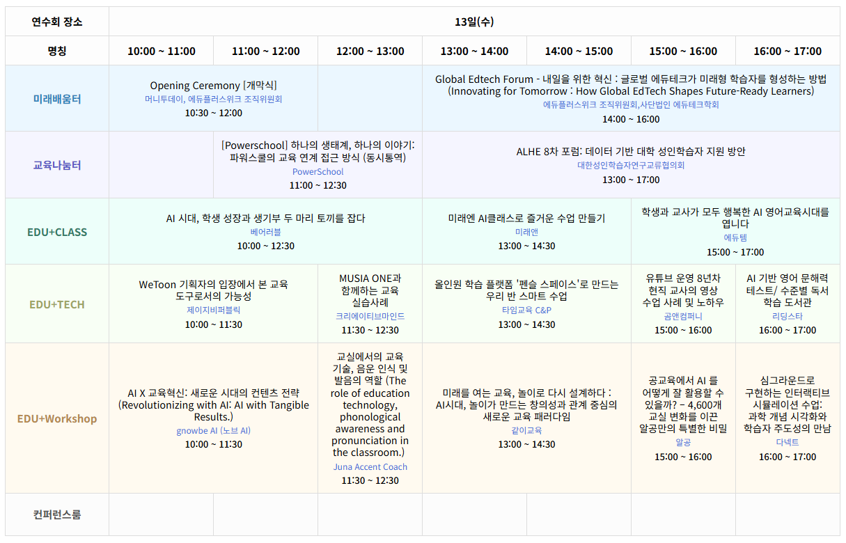EDU+CLASS에서는 AI 시대 학생 성장과 생기부 토픽을 잡는 강연이 오전 타임에 배치돼요. 오후에는 미래엔이 시클래스로 즐거운 수업 만들기를 다루고, 에듀봇이 영어교육 시대를 여는 사례를 들고 와요. 시간대가 10:00~12:30, 13:00~14:30, 15:00~17:00으로 깔끔하게 나뉘어요. 중간 휴식에 전시장 투어를 배치하기 좋아요.