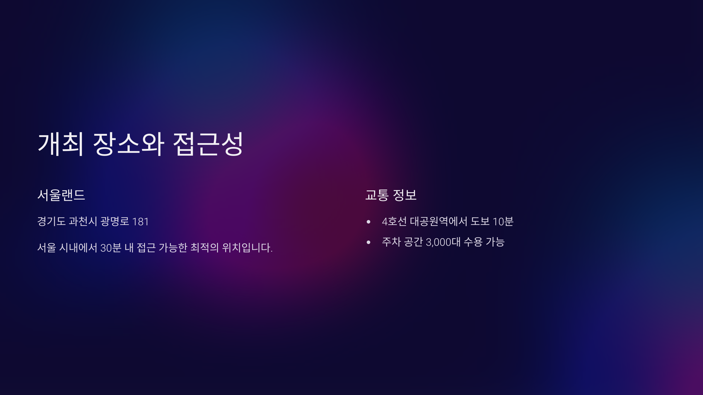주차 공간은 마련되어 있지만, 페스티벌 당일엔 혼잡할 수 있기 때문에 대중교통 이용을 강력히 추천해요. 주최 측에서도 별도 셔틀버스를 운영할 계획이라고 밝혔는데, 이는 추후 공식 홈페이지를 통해 공지된다고 해요. 근처에 대형 쇼핑몰과 음식점, 카페도 많아서 이동 전후의 동선까지 고려할 수 있어요.
