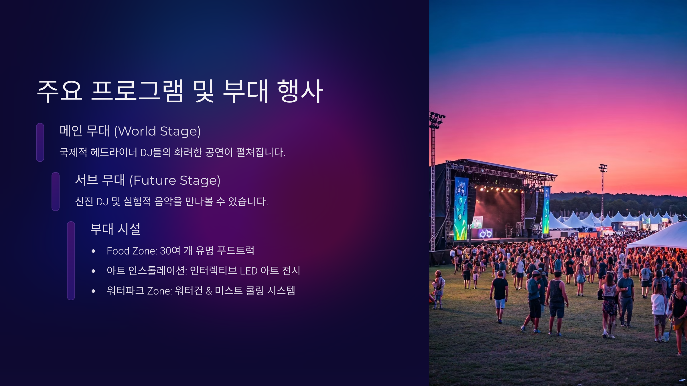 체험형 부스들도 인기가 많아요. EDM 기초 DJing 체험존, AR 포토존, 플로어 라이트 댄스 체험, 페이스 페인팅 등 다양한 액티비티가 준비되어 있어서 친구들과 특별한 추억을 만들 수 있답니다. 밤에는 네온 글로우 페인팅 이벤트와 함께 무대 밖에서도 화려한 분위기를 만끽할 수 있어요!