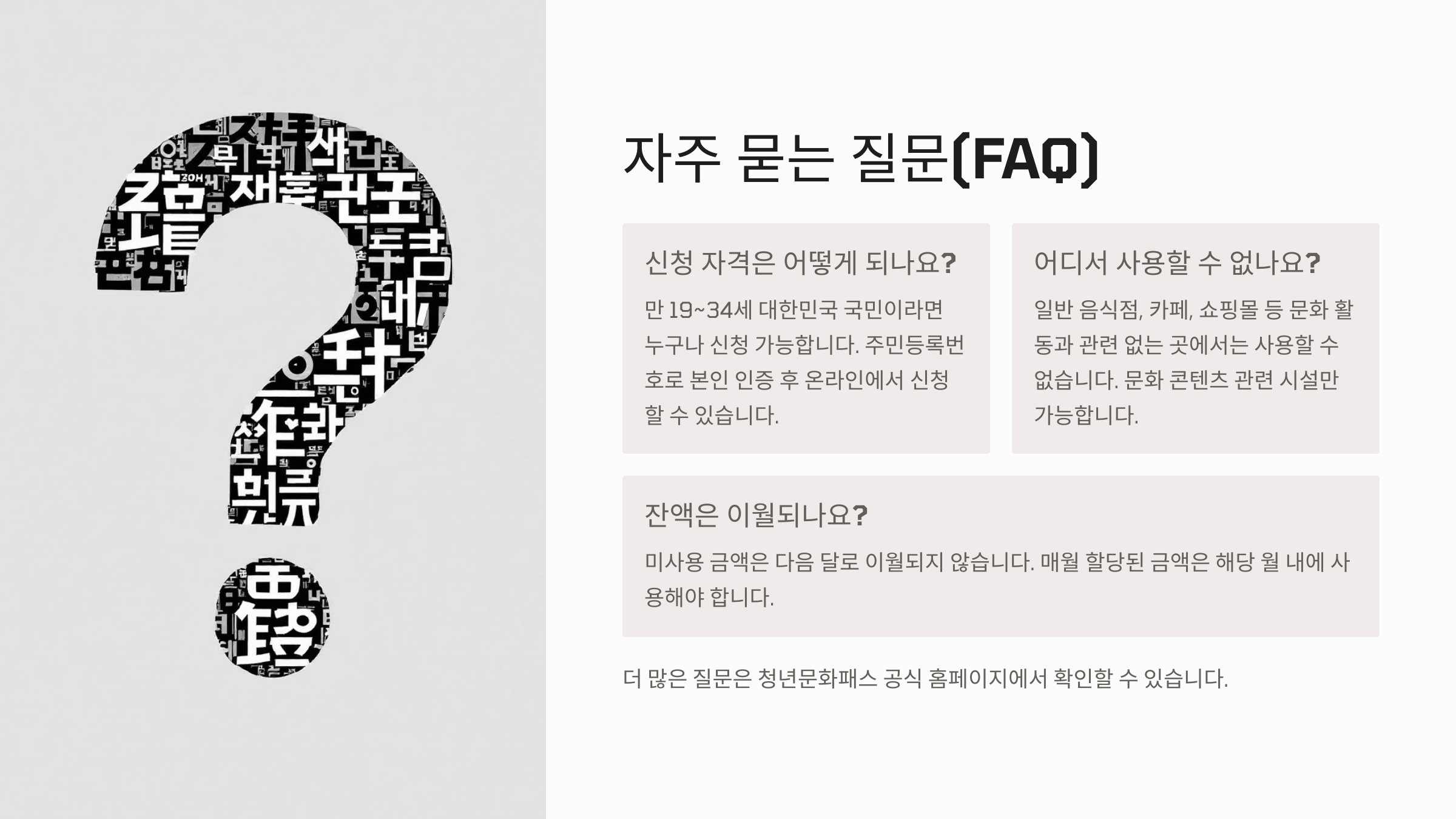 한 걸음 내딛는 순간, 문화가 여러분 삶 속으로 스며드는 걸 느낄 수 있을 거예요. 청년문화패스와 함께 매일매일을 특별하게 만들어봐요! 🚀❤️