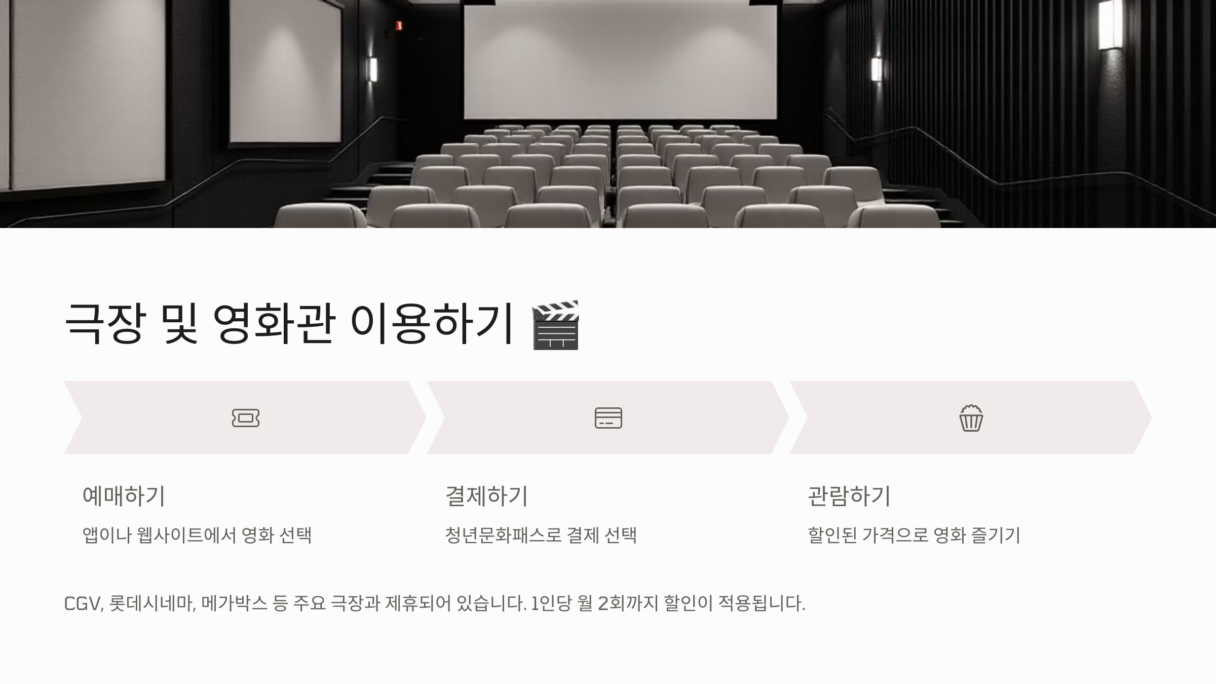 예를 들어, CGV, 롯데시네마, 메가박스 같은 대형 영화관에서도 사용할 수 있고, 세종문화회관이나 예술의전당 같은 공연장에서도 청년문화패스를 제시하면 다양한 혜택을 받을 수 있어요.