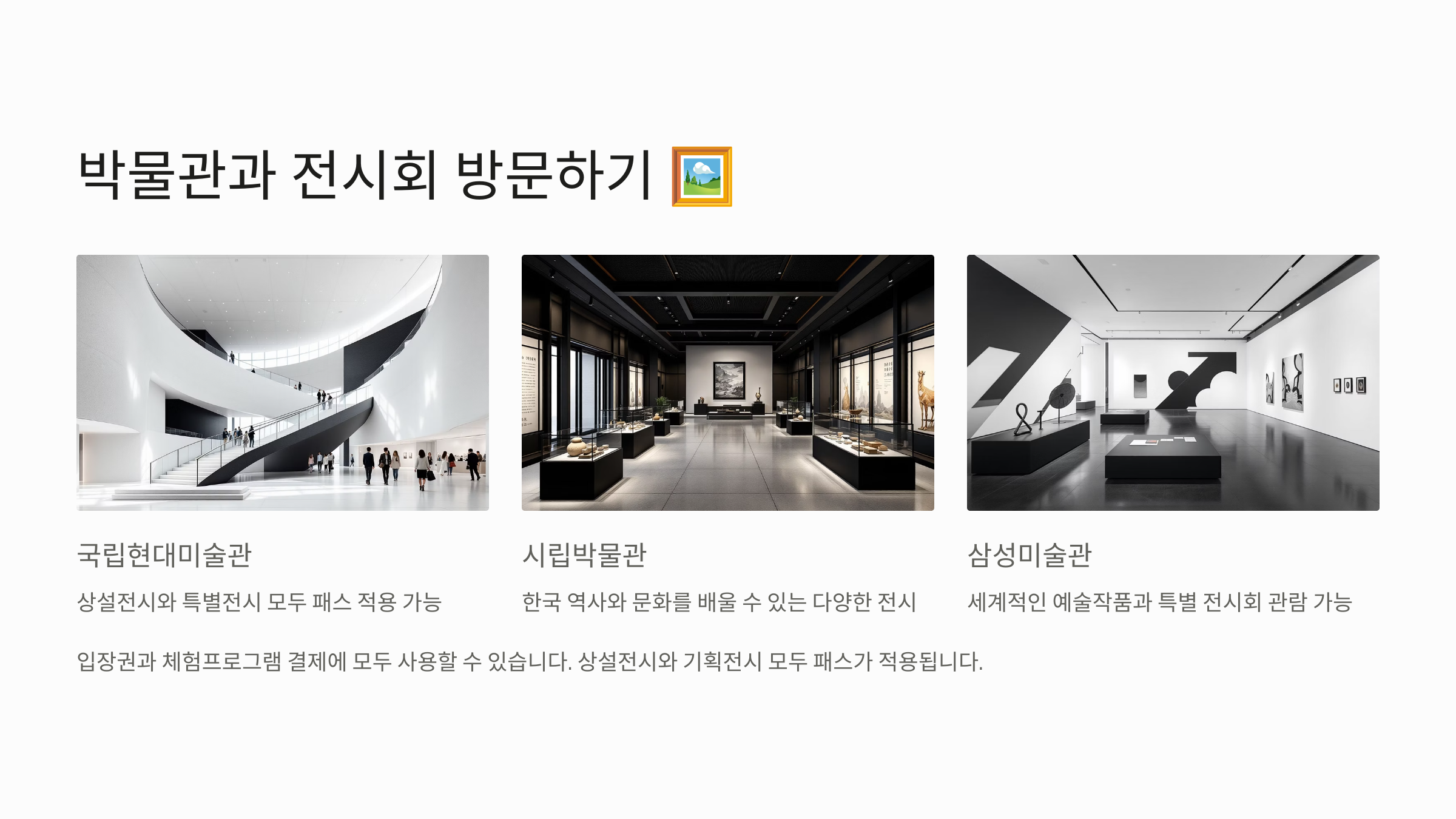 미술을 사랑하는 청년들에게는 국립현대미술관, 리움미술관, 서울시립미술관 같은 곳이 추천돼요. 입장료가 부담스럽던 전시회도 이 패스를 이용하면 훨씬 쉽게 방문할 수 있어요.