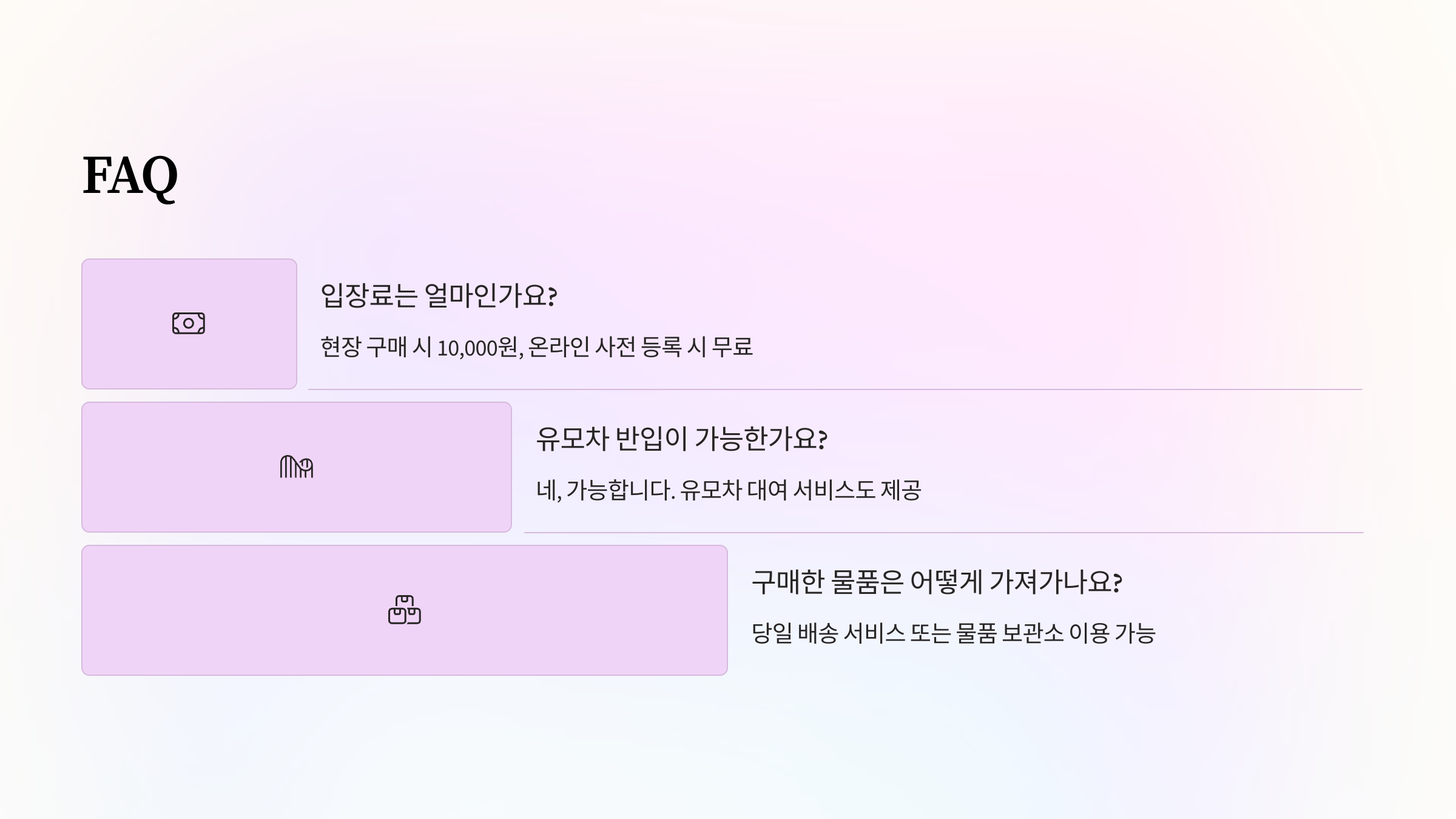 A3. 사전등록 선물, 부스별 스탬프 투어, SNS 인증 이벤트 등 다양한 방법으로 받을 수 있어요. 각 부스 앞 안내를 꼭 확인해 보세요!