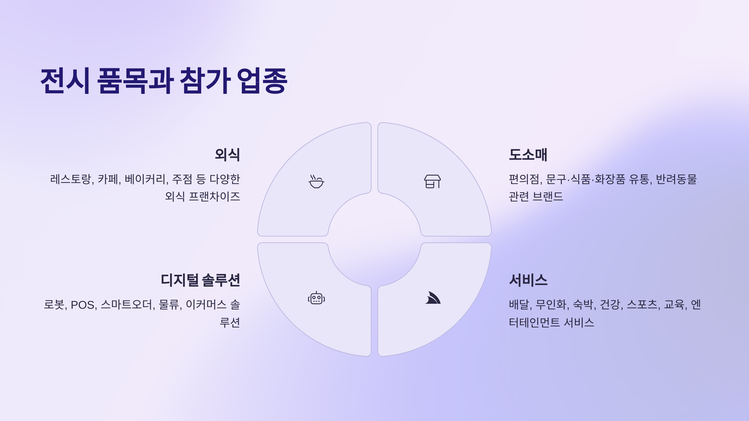 프랜차이즈 산업은 외식뿐만 아니라 도소매, 서비스까지 확장되었기 때문에 관련 제품과 솔루션들이 한자리에 모인다는 점이 이 박람회의 강점이에요. 예를 들어 차량 공유 기반 퀵서비스 플랫폼, 반려동물 용품 전문 프랜차이즈 같은 최신 트렌드도 확인할 수 있어요.