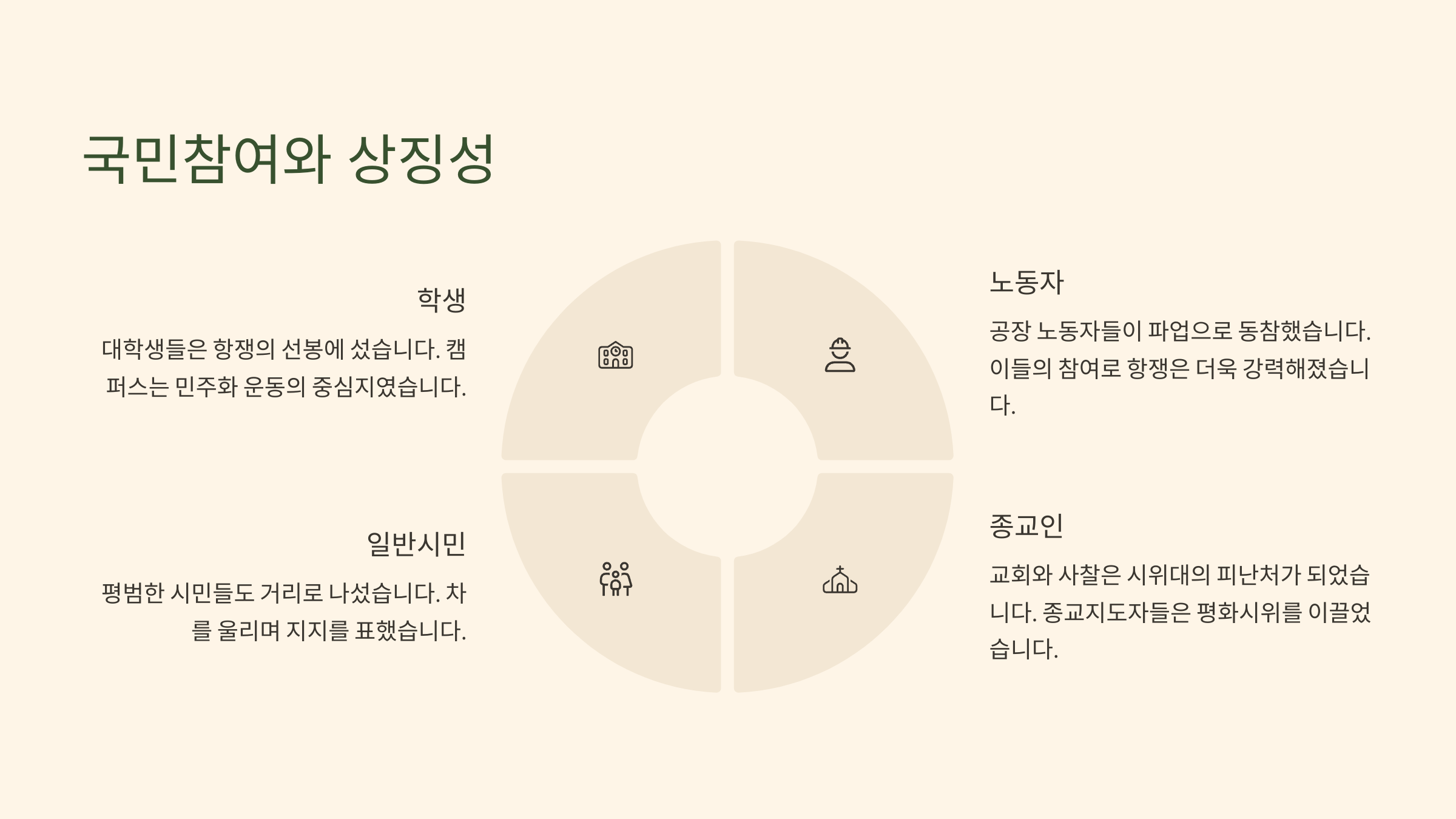 🕊️6월 민주항쟁은 단순히 정치 개혁의 성과에만 머무르지 않았어요. 그보다 중요한 건 바로 ‘모든 국민이 역사에 참여했다’는 자각과 경험이에요. 남녀노소, 학생, 노동자, 종교인, 예술가, 기업가까지, 계층과 세대를 초월한 연대가 이뤄졌다는 점에서 전례 없는 참여형 항쟁이었죠.